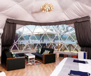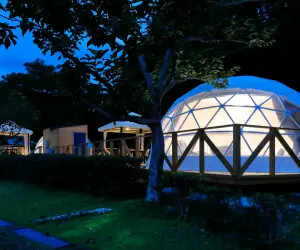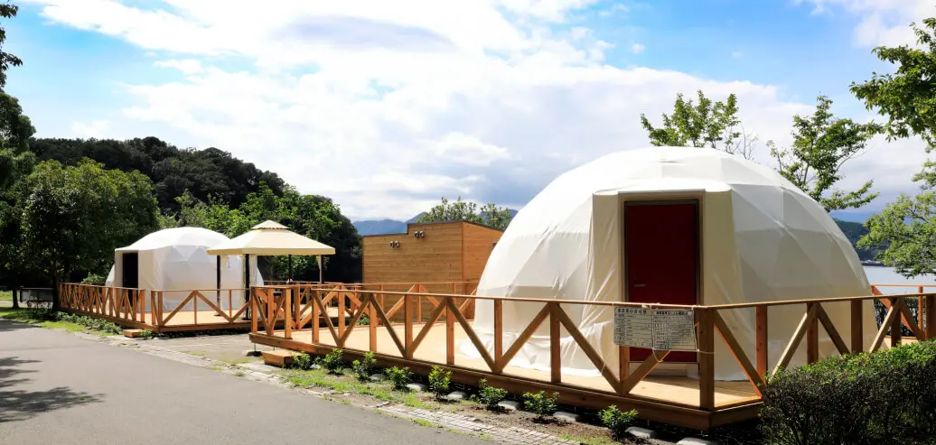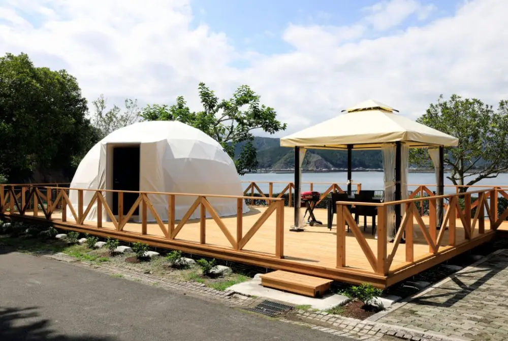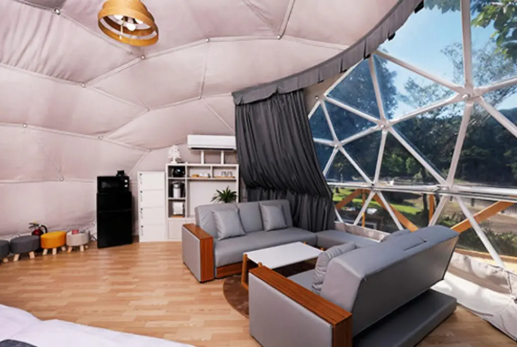 ドームテントは純国産の部材を使用し、急な天候の変化などが起こっても安心・安全にご利用いただけるよう、大雨や突風にも耐えられる作りになっております。 室内は冷暖房を完備しており、快適にお過ごしいただけます。 ・フリーサイズのパジャマも用意しております。(子供用や大きなサイズはありませんのでご持参ください) ・定員4名(3名様以上はソファーベッドでのご就寝となります) ※大型台風の襲来などが予想される場合は、ご利用を控えて頂く場合があります。