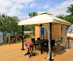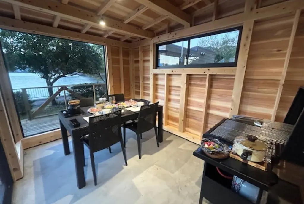 ガゼボは屋内のため、雨の日でも安心してご利用いただけます。 テーブルと椅子があり、食事などはご指定の時間にガゼボに用意させていただきます。 ※BBQグリルはお食事のときに準備させていただきます。 面倒な食事の準備や片付けも不要です。 (夕食で使った食器などはお食事開始時間から2時間目処で頃回収に伺います)