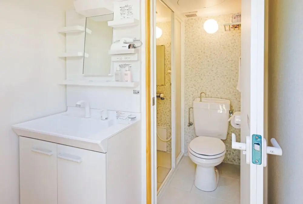 グランピングドームウッドデッキの敷地内に専用のトイレ・シャワー棟がございます。 洗面台、シャワールームにはそれぞれタオル等の備品を備え付けていますのでご利用下さい。
