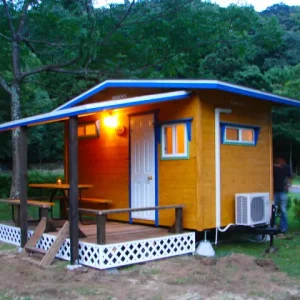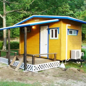 小さなテラスやテント設営スペースのあるログキャビンです。