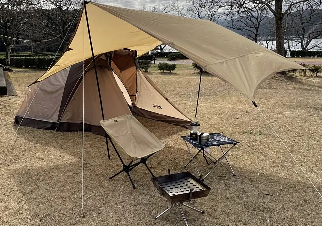 ソロテント、ソロ用タープ、ソロ用テーブル、ロースタイルチェア、LEDランタン、焚き火台、インフレータ式インナーマット、寝袋、クッカーセット、 ピラミッドグリル・コンパクト