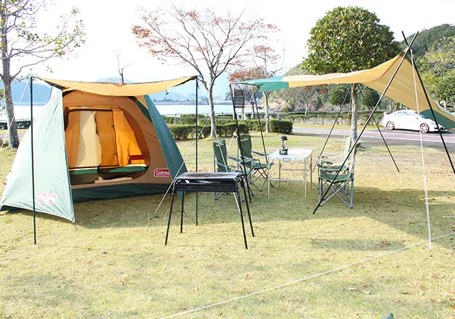 テント、コット*2、テーブル、チェア*4、食器*4、オイルランタン、LEDライト、インフレーターマット*2、円形ラグ、ラック、連結照明ライト